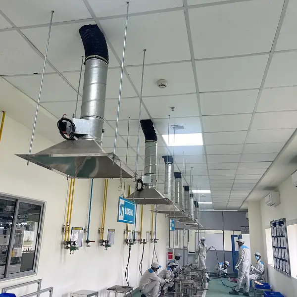 - Airflow Calculation – Airflow requirements are calculated as per ACGIH guidelines, and optimized suction hoods are designed to ensure maximum fume capture with minimal losses.